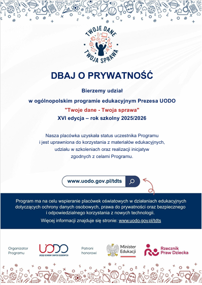 Szkolnym koordynatorem programu jest p. Anna Janik nauczyciel informatyki. Nauczyciele z naszej szkoły realizują zagadnienia ochrony danych na zajęciach lekcyjnych i godzinach wychowawczych. A w naszej placówce bardzo dużą wagę przywiązuje się do ochrony danych uczniów, rodziców i nauczycieli.