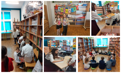 Podczas zajęć uczniowie zostali zapoznani z zasadami korzystania z biblioteki oraz wypożyczania książek. Nie zabrakło również ciekawych i angażujących aktywności. Dzieci wzięły udział w zabawie „głuchy telefon”, w której hasłami były trudne i nieznane słowa związane z książkami i biblioteką, takie jak: introligator, skontrum, cymelia czy dezyderat.