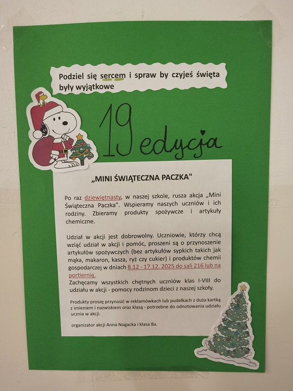 Już po raz dziewiętnasty, w naszej szkole, rusza akcja ,,Mini Świąteczna Paczka". Wspieramy naszych uczniów i ich rodziny. Zbieramy produkty spożywcze i artykuły chemiczne.